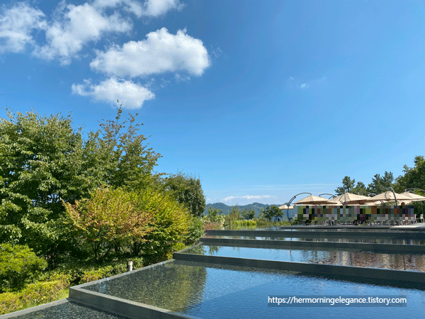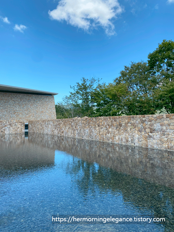 뮤지엄산은 물이 주는 느낌도 참 좋습니다. 자갈이 비치는 얕은 물이 관람 동선을 따라 이어지는데요. 맑은 날에 구름까지 비치면 한층 매력있는 공간이 됩니다.