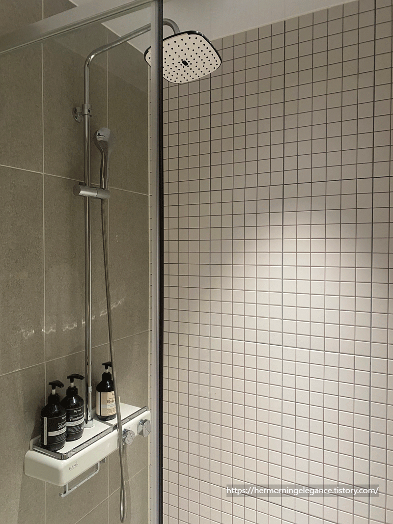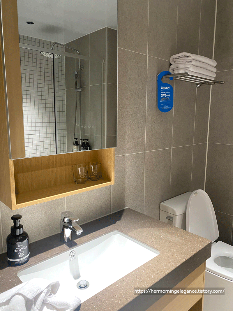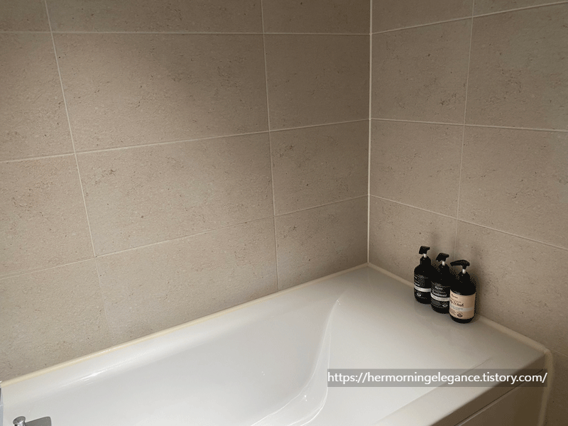 화장실이 두 개입니다! 각각 욕조와 샤워부스가 있습니다. 양쪽 모두 공간이 넓고 새 건물이라 그런지 전체적으로 깨끗했어요. 공용 바디워시, 샴푸, 트리트먼트, 핸드워시가 있었고요. 수건도 넉넉했고, 드라이기와 여분 화장지, 그리고 일회용 세탁세제가 있었습니다. 세탁기 사용이 가능한 점도 체스터톤스 호텔의 장점이죠.
