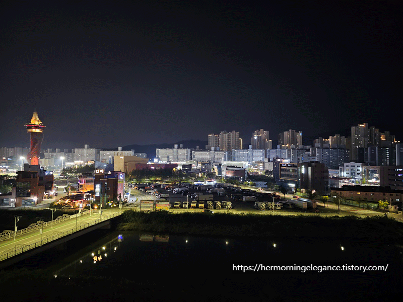C동 713호 뷰입니다! 모바일 체크인을 했는데요. 미리 청초호 뷰를 볼 수 있는 방번호를 숙지한 후 3시 정각에 빠르게 골랐어요. 고개를 왼쪽으로 조금 많이 돌리면 청초호가 보이는 뷰입니다. 청초호로 흘러가는 청초천이 정면으로 보입니다. 야경도 멋지고 나름 만족했던 뷰였습니다.
