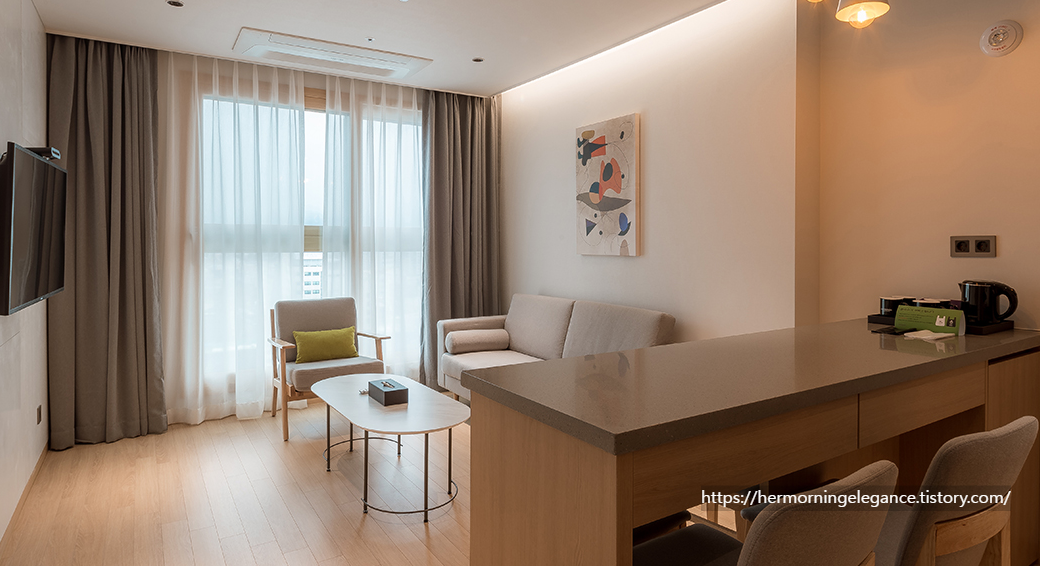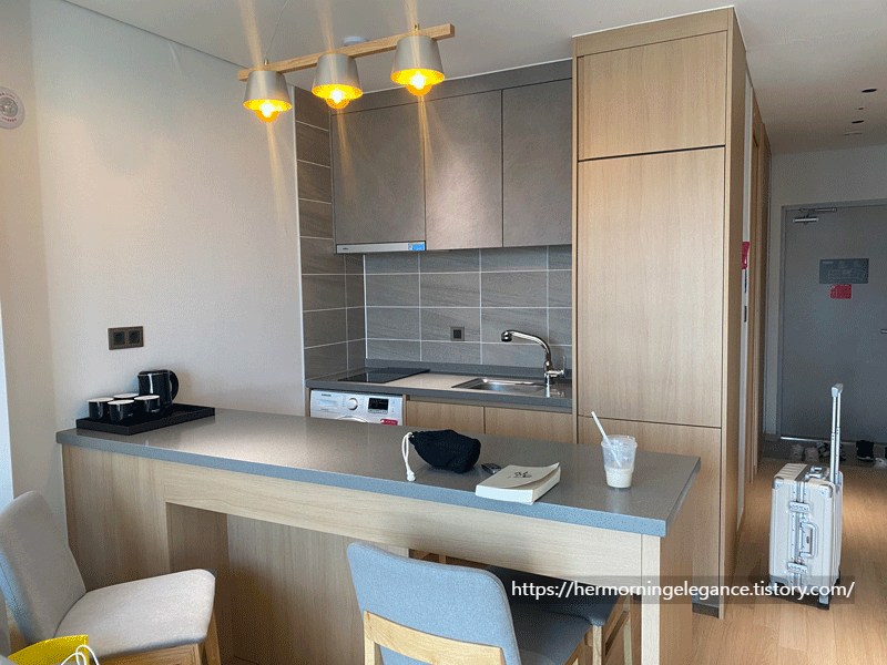 내부는 호텔이라기보다는 깔끔한 오피스텔 생각하면 됩니다. 거실겸 주방, 방 두 개, 화장실 두 개가 있는 구조입니다. 거실은 많이 넓지는 않지만 성인 4명이서 이용하기에 불편함은 없었어요. 주방 앞쪽으로 아일랜드 식탁이 있습니다. 식탁이 조금 좁아서 불편하긴 한데 공간활용을 잘한 것 같아요. 주방은 있지만 취사는 할 수 없어요. 커피포트 정도만 이용할 수 있었고, 취사는 공용주방인 요리공작소를 이용할 수 있습니다.