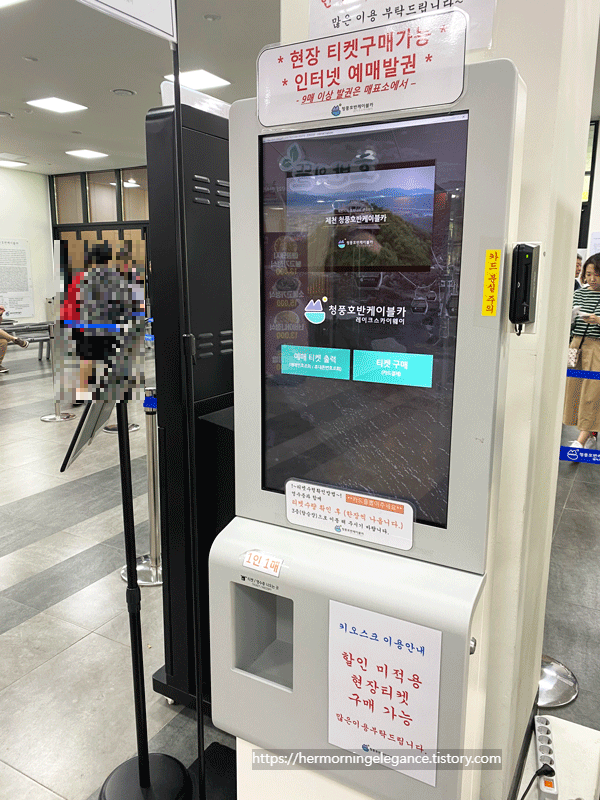 청풍호반 케이블카 홈페이지에서 예매가 가능한데 당일예약은 안 돼서 현장에서 발권했습니다. 키오스크에서 예매했고요. 주말 오전이었는데 대기 없이 바로 예매할 수 있었어요. 예매창구에도 줄은 길지 않았습니다. 단체는 예매 창구에서 하래요.