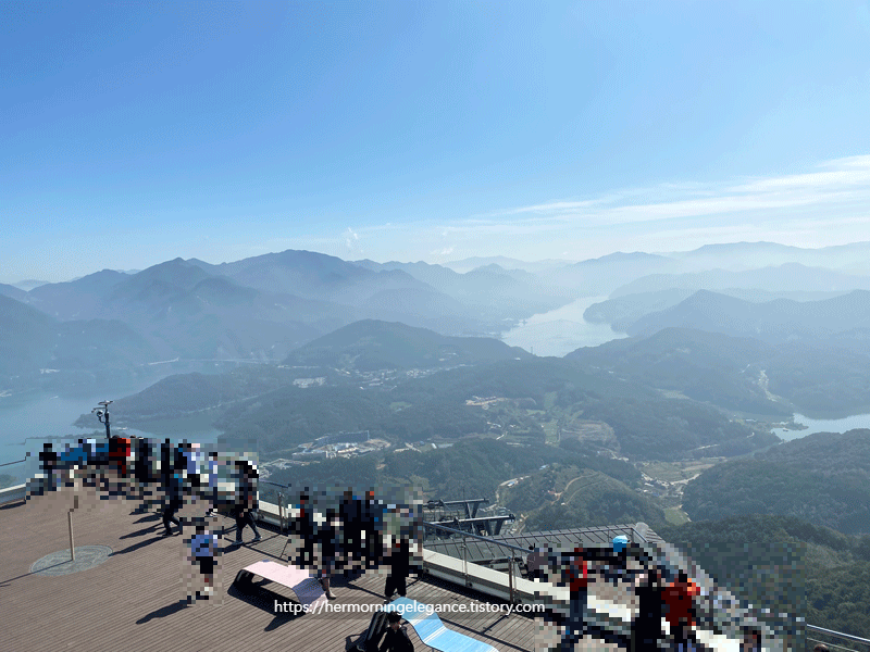 청풍호반케이블카가 비봉산역에서 도착하면 바로 전망대가 있습니다. 전망대가 정말 넓어요. 모든 방향의 풍경을 볼 수 있는데 모든 방향이 전부 멋이 있습니다. 산이 왜이렇게 많은가요. 사방이 산입니다. 소백산, 월악산, 치악산이 보인대요. 그리고 바다 같은 청풍호가 시강입니다.
