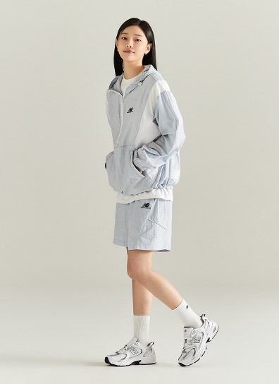 제품명은 UNI 경량 컬러블록 후드아노락이고, 정가는 159,000원입니다. 색상은 화이트 / 블랙 / 라이트 블루 세 가지가 있어요. UNI 경량 우븐쇼츠 제품을 구매하면 아래위 세트로 입을 수 있는 것 같습니다.
