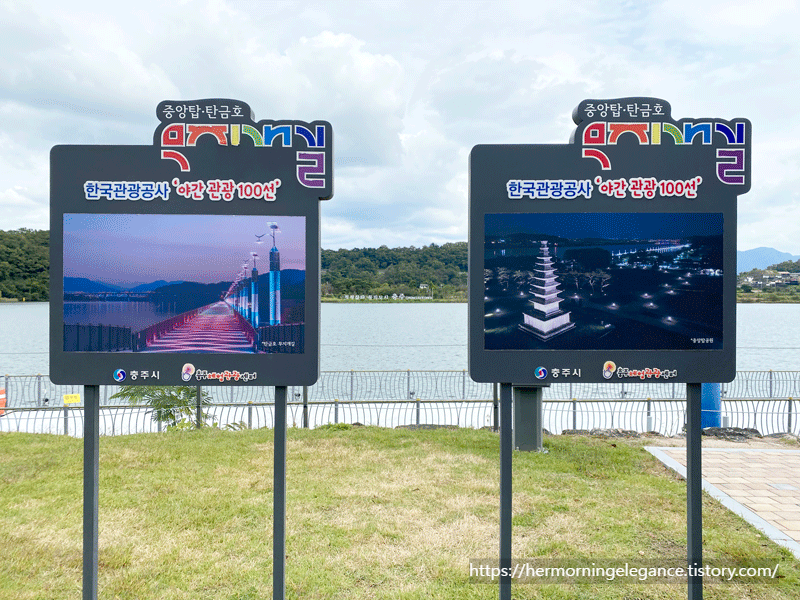 충주 중앙탑사적공원은 밤에와도 좋은 곳인데요. 탄금호 무지개길은 밤이되어 조명을 밝히면 또다른 매력이 있는 곳입니다. 한국관광공사에서 선정한 야간관광 100선 중 한 곳이에요.