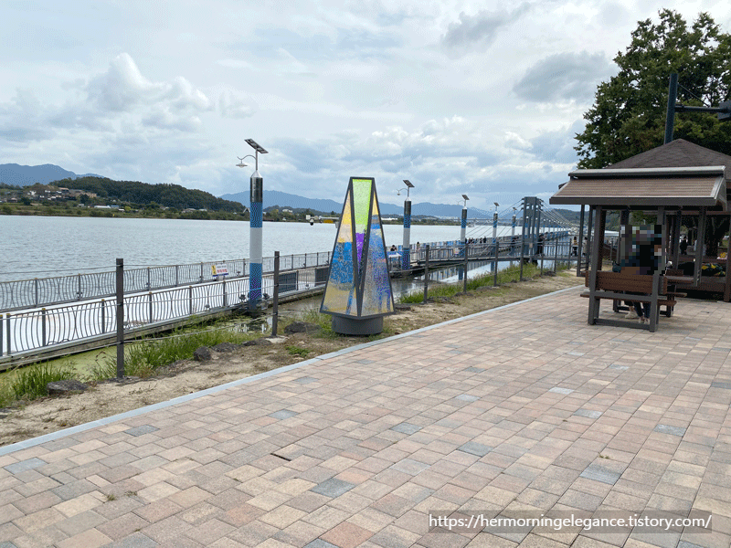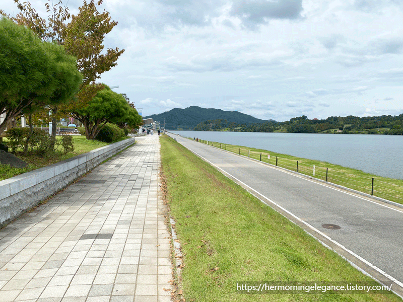 중앙탑 말고도 이 공원은 바로 옆으로 흐르는 남한강까지 있어서 더욱 매력이 있는데요. 메밀마당에서 점심을 먹고 강변을 따라 걸으니 딱 자연스러운 충주 여행 일정이 만들어지더라고요.