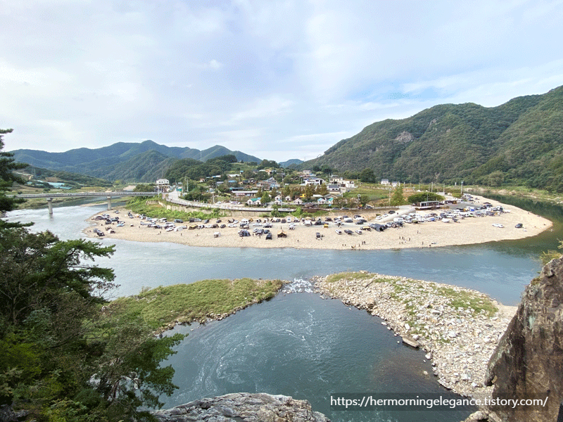 충주 여행의 마지막장소는 수주팔봉이었는데요. 수주마을과 팔봉마을을 에워싼 깎아지른듯한 봉우리를 말합니다. 수주 팔봉에는 짧은 출렁다리가 만들어져 있고, 건너편 자갈밭은 차박 캠핑장소로도 유명해요. 많이 높지 않아서 계단을 따라 금새 올라갈 수 있는데 둥근 마을과 폭포가 어우러진 풍경이 아주 멋진 곳입니다.